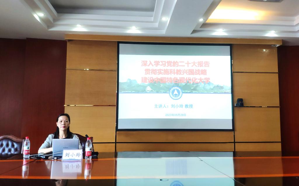 5月28日周日,广西大学副教务长研究生院院长、教授、博士生导师刘小玲在飞天楼517会议室,为我校教师作了PA官方网站《深入学习党的二十大报告 贯彻实施科教兴国战略 建设中国特色现代化大学》的专题报告。学工部(处)、发规处、人事处、教务处、科技处、财务处主要负责人;各教学单位行政工作主要负责人;硕士点召集人、硕士点方向负责人及教师代表出席并聆听了报告。