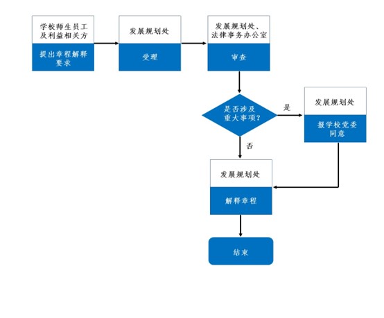 学校师生员工及利益相关方,对执行或适用中有疑义或异议的章程条文,需要进一步解释以明确具体含义的,应以书面形式向学校发展规划处提出,并说明发生疑义或异议所涉及的条文及申请解释的理由。